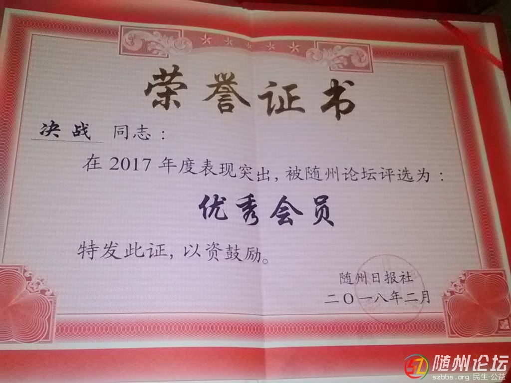 正文摘要:本帖最后由 決戰(zhàn) 于 2018-2-12 22:58 編輯 臘月二十七。我今天上午,抽時(shí)間去沿河大道隨州日?qǐng)?bào)社一樓隨州論壇辦公室,找劉站長(zhǎng)領(lǐng)取了證書(shū)。并與百姓之聲諸位大版主短暫交流。 & ... |