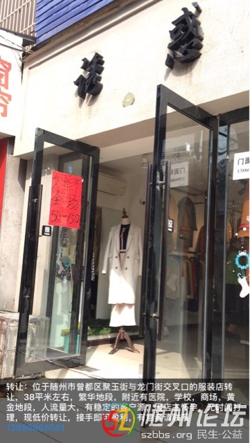 轉(zhuǎn)讓:位于隨州市曾都區(qū)聚玉街與龍門街交叉口的服裝店轉(zhuǎn)讓,38平米左右,繁華地段,附近有醫(yī)院,學(xué)校,商場,黃金地段,人流量大,有穩(wěn)定的客戶源,因店主懷孕,無時(shí)間打理,現(xiàn)低價(jià)轉(zhuǎn)讓,接手即可盈利,有意者請聯(lián)系 ...