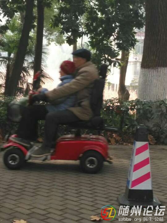 老人帶著老伴,那是一種幸福!建議:年紀大了還是不要上機動車道好。 |