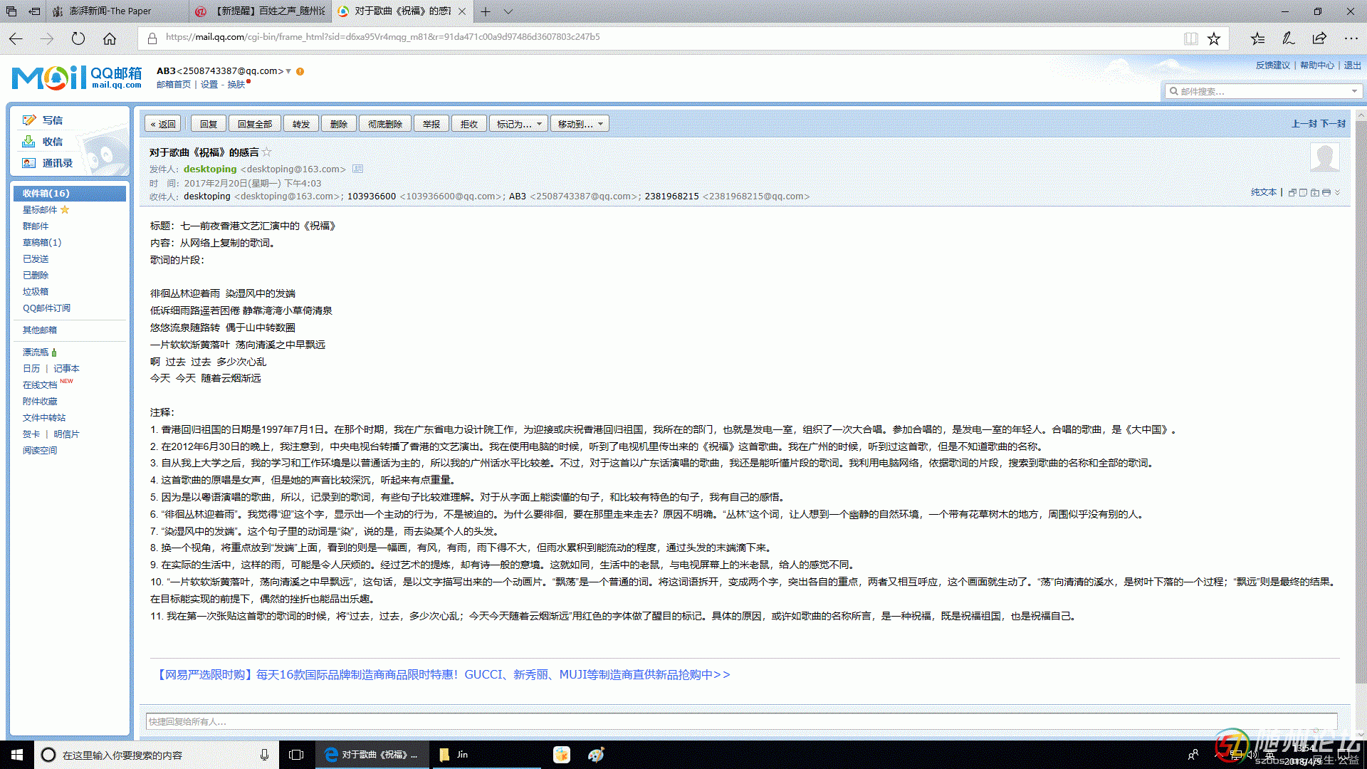 標(biāo)題:七一前夜香港文藝匯演中的《祝?!? 內(nèi)容:從網(wǎng)絡(luò)上復(fù)制的歌詞。(于2012年7月2日首次張貼于隨州論壇) 歌詞的片段: 徘徊叢林迎著雨 染濕風(fēng)中的發(fā)端 低訴細(xì)雨路遙若困倦 靜靠灣灣小草倚清泉 悠悠 ...