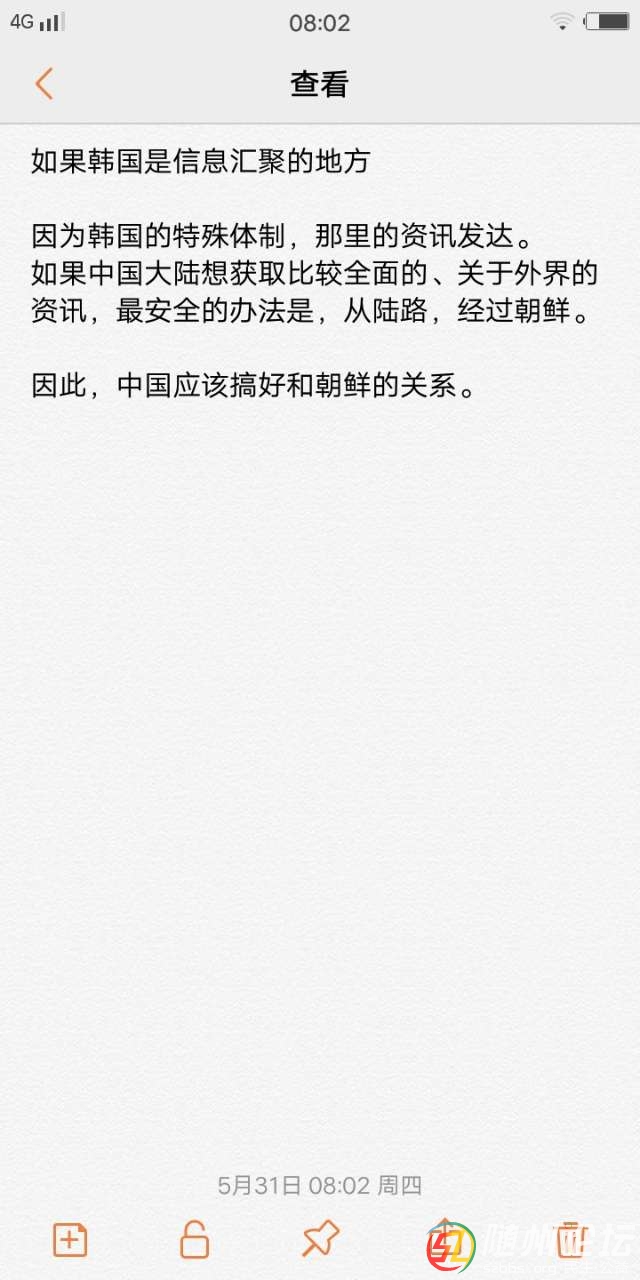 如果韓國是信息匯聚的地方 因為韓國的特殊體制,那里的資訊發(fā)達(dá)。 如果中國大陸想獲取比較全面的、關(guān)于外界的資訊,最安全的辦法是,從陸路,經(jīng)過朝鮮。 因此,中國應(yīng)該搞好和朝鮮的關(guān)系。 ...