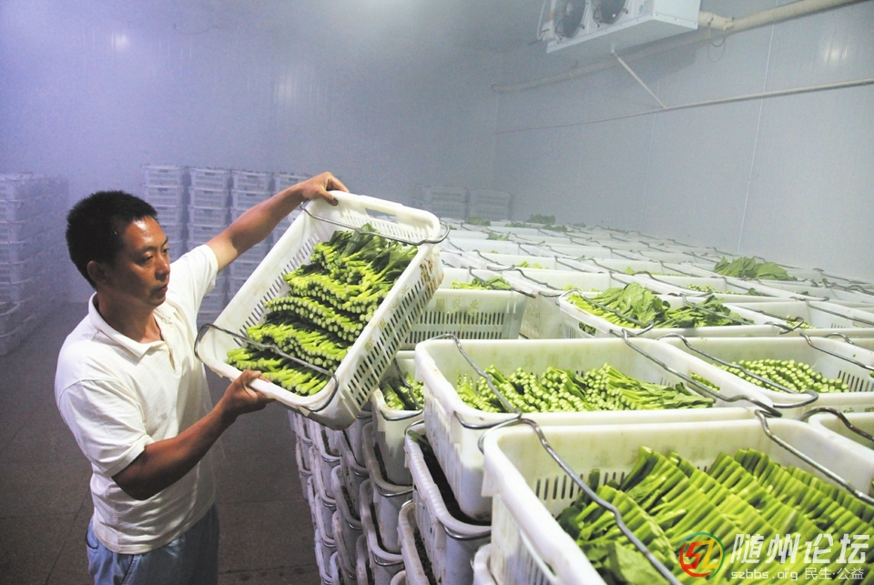 4 |$ ^) {# b4 u* @( V 湖北瓊圃現(xiàn)代農(nóng)業(yè)公司在隨縣安居鎮(zhèn)流轉(zhuǎn)千余畝農(nóng)田,實行“公司+基地+農(nóng)戶”的運作模式,種植供港蔬菜。蔬菜采用全程冷鏈運輸,確保純正品質(zhì)。圖為工人將新鮮采摘的蔬菜放入凍庫等待裝車運輸 ...