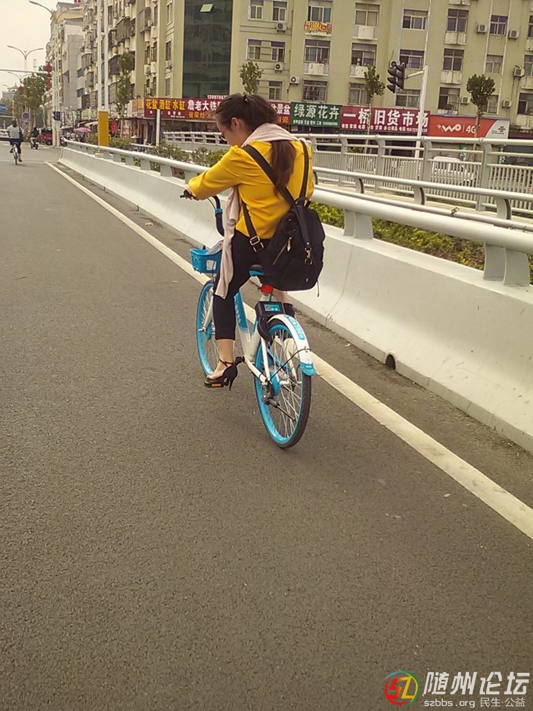 隨州美女騎的哈羅單車后輪子癟癟歪歪