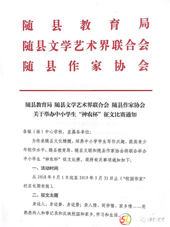 各鎮(zhèn)(場(chǎng))中心學(xué)校,直屬各單位:2 N# b$ c2 Q3 `- G% T9 z6 J 為傳承隨縣文化精髓,培養(yǎng)中小學(xué)學(xué)生寫作興趣,提高 青少年創(chuàng)作水平.隨縣教育局、隨縣文聯(lián)和隨縣作家協(xié)會(huì)將聯(lián) 合舉辦中小學(xué)生“神農(nóng)杯”征文比賽,同 ...