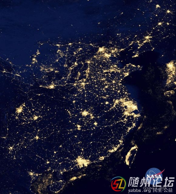 衛(wèi)星照片顯示:地球上中國(guó)的夜晚只有長(zhǎng)三角、珠三角、京津環(huán)渤海灣點(diǎn)亮的面積是最大的。江城武漢也能看見(jiàn)一個(gè)大亮點(diǎn)。臺(tái)灣西部城市較亮。請(qǐng)?jiān)徫铱床灰?jiàn)隨州,可能得用顯微鏡看了。![]() ![]() ![]() ![]() ![]() 來(lái)自: Android客戶(hù)端 |