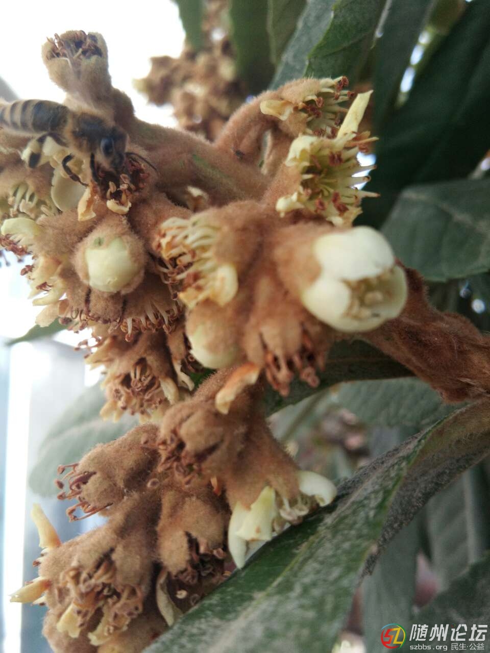 今天溫度還可以,太陽一直躲著下午才出來,枇杷開花了,引來一群蜜峰來采蜜。