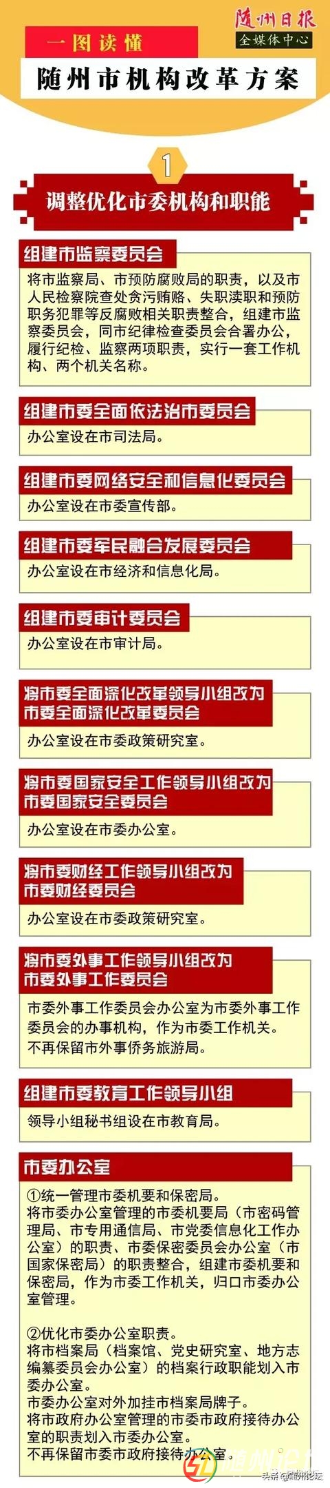 正文摘要:近日,湖北省委省政府批復(fù)了《隨州市機(jī)構(gòu)改革方案》。2月14日,隨州市機(jī)構(gòu)改革動員會召開,對全市機(jī)構(gòu)改革作了安排部署。改革后,市本級共設(shè)置黨政機(jī)構(gòu)47個,其中市委機(jī)構(gòu)14個(含紀(jì)檢監(jiān)察機(jī)關(guān)1個,工作機(jī)關(guān)13個), ... |
