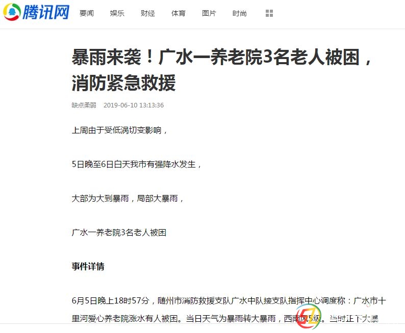 事件詳情 6月5日晚上18時57分,隨州市消防救援支隊廣水中隊接支隊指揮中心調(diào)度稱:廣水市十里河愛心養(yǎng)老院漲水有人被困。當日天氣為暴雨轉(zhuǎn)大暴雨,西南風5級。當時正下大暴雨,流水湍急。天色較暗,視線很差, ...