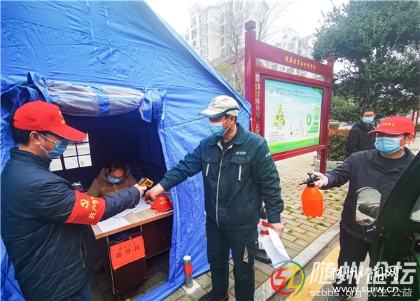 隨州日報(bào)訊 曾都區(qū)煙草專賣局全體黨員干部,除值班人員外,均就近參加各社區(qū)卡口值守。圖為該局志愿者在文峰塔社區(qū)值守點(diǎn)對出入人員進(jìn)行檢測登記和防護(hù)消毒。(隨州日報(bào)全媒記者 李文 ...