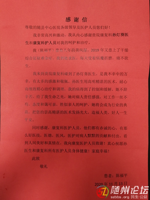 隨縣中醫(yī)醫(yī)院康復(fù)科醫(yī)生孫燈奎精心救治患者,收到感謝信!感謝廣大病友對隨縣中醫(yī)醫(yī)院的信任和肯定!我們將一如既往,以舒適的環(huán)境,過硬的技術(shù),暖心的服務(wù),竭誠為隨縣人民群眾的身體健康服務(wù)! ...