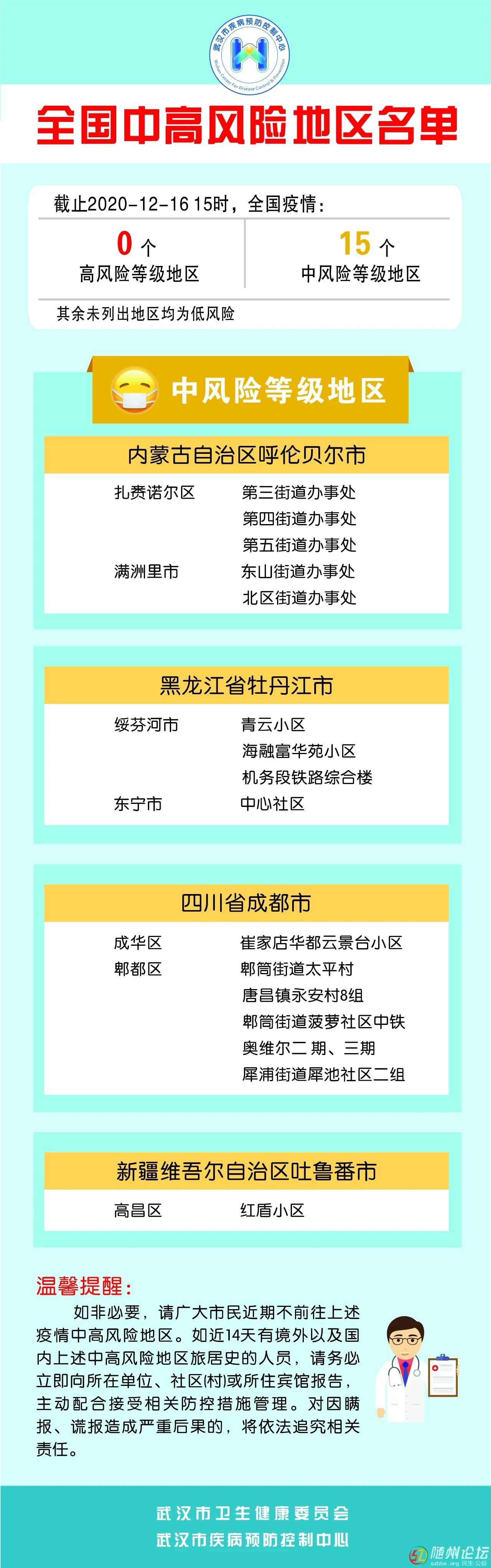 12月16日武漢市疾控中心發(fā)布了“全國疫情中高風(fēng)險(xiǎn)地區(qū)最新名單” 并進(jìn)行了溫馨提示 來源:武漢市疾病預(yù)防控制中心
