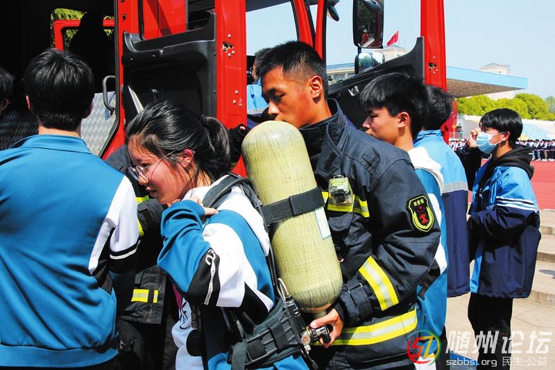 近日,廣水市第一高級中學(xué)組織開展消防逃生應(yīng)急疏散演練。消防官兵針對演練情景作出詳細(xì)點(diǎn)評,現(xiàn)場講解消防知識。師生們參觀了消防器材裝備區(qū)。圖為部分學(xué)生佩戴試穿個(gè)人防護(hù)裝備,化身小小“消防員”。 (隨 ...