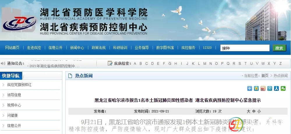 9月21日,湖北省疾控中心官網(wǎng)發(fā)布緊急提示:9月21日,黑龍江省哈爾濱市通報(bào)發(fā)現(xiàn)1例本土新冠肺炎陽性感染者。提示中要求:2021年9月7日(含)以來有黑龍江省哈爾濱市巴彥縣、道里區(qū)、南崗區(qū)旅居史的來鄂返鄂人員在做 ...