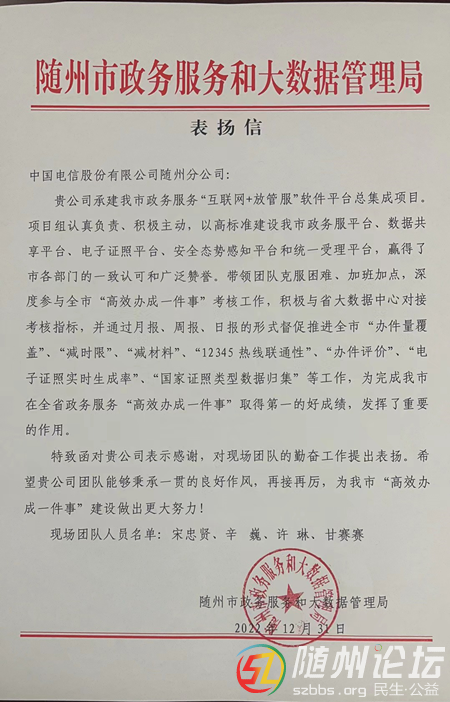 正文摘要:本帖最后由 王盡歡 于 2023-1-3 10:50 編輯 “互聯(lián)網(wǎng)+放管服”駐點(diǎn)團(tuán)隊(duì)獲市政務(wù)服務(wù)和大數(shù)據(jù)管理局表?yè)P(yáng)信 隨州論壇訊(通訊員云中臺(tái)、辛巍)自2019年“互聯(lián)網(wǎng)+放管服”項(xiàng)目中標(biāo)建設(shè)以來(lái),中國(guó)電信隨州分公司派駐 ... |