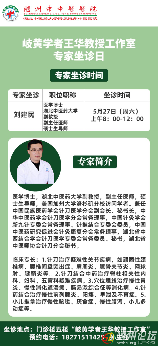 “岐黃學(xué)者王華教授工作室”劉建民教授5月27日(本周六)上午來中醫(yī)院坐診