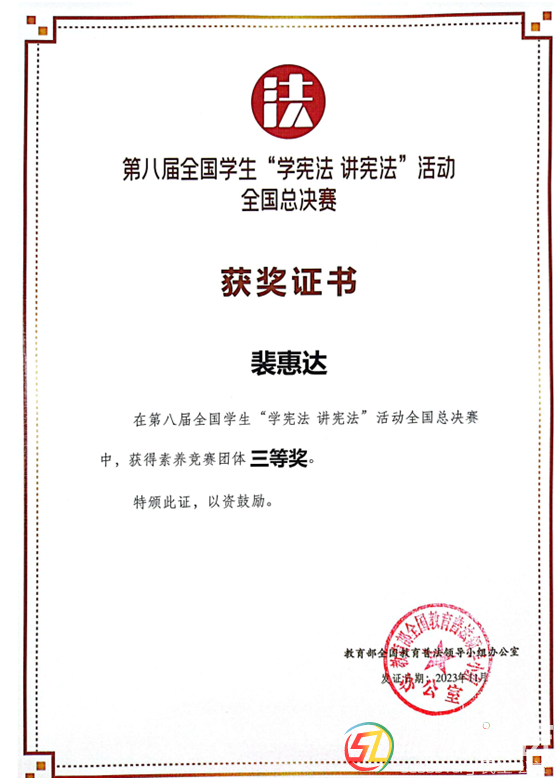 隨縣普法工作再傳“好消息”!隨縣炎帝學(xué)校裴惠達(dá)同學(xué)勇奪全國“學(xué)憲法 講憲法”三等獎 “崇尚憲法,致力遠(yuǎn)行。”在全國第十個國家憲法日到來之際,隨縣普法工作再傳“好消息”!隨縣炎帝學(xué)校裴惠達(dá)同 ...