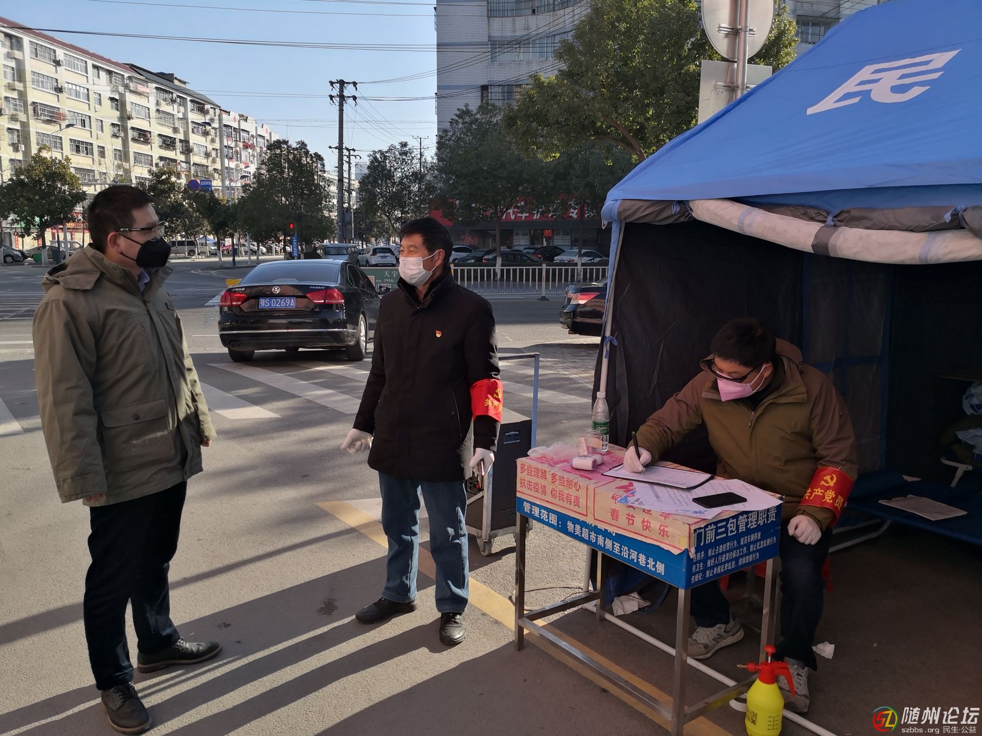 $ J* K# h- c+ C l) K0 d' P 隨州市城東社區(qū)公租房有3000多戶,七八千人口,人員素質(zhì)參差不齊,工作量大,工作難度可想而知。志愿者們被分成班組輪流值守在小區(qū)唯一的出入口,測體溫,消毒,登記,巡邏以及為居民解決生活上的困難。只要有人找到或聯(lián)系到錢顯軍時,他二話不說盡全力滿足大家的要求。他每天早晨五點(diǎn)準(zhǔn)時起床,在家里匆匆吃過早餐就出發(fā)去社區(qū)輪班,直到晚上十一二點(diǎn)鐘才回家,有時候甚至到深夜一二點(diǎn)鐘。為了嚴(yán)防堅守,在就餐時間段幾個人就在值守點(diǎn)傍輪流吃幾口盒飯,中途困了就近找個地方靠一靠算是休息。寒冬時節(jié),隨州早晚溫度在零度左右,期間有幾天還下起了大雪,惡劣的天氣以及被感染的高風(fēng)險,時時都在考驗(yàn)著錢顯軍這樣的志愿者們。對于他們的艱辛付出,小區(qū)居民們也是看在眼里記在心里,有些熟悉的人說:“錢總您是好樣的,等疫情過去了到我們家來做客,要好好感謝您”。錢顯軍卻總是這樣回答道:“我們志愿者不圖名不圖利,只需要大家的理解就夠了”。就這樣一干就是一個多月,經(jīng)過政府各職能部門和志愿者們的共同努力,這個公租房小區(qū)被管理得井井有條,生活物資保障有力,看病就醫(yī)都能有序進(jìn)行。4 I3 M. G! [& c