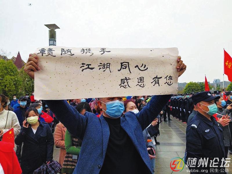 他們或揮舞五星紅旗,或手捧鮮花,或手提隨州土特產(chǎn);送別人群中,有頭發(fā)花白的老者,也有和父母一同前來的少年?!跋蜃蠲滥嫘姓咧戮础薄爸x謝你們?yōu)殡S州拼過命”“專汽拐子飯,老表瓦罐湯,春草明年綠,親人歸不歸”……一條條市民自發(fā)制作拉起的送別橫幅,滿是感恩與不舍。 , e; p* x( O/ m% B, z0 @6 i