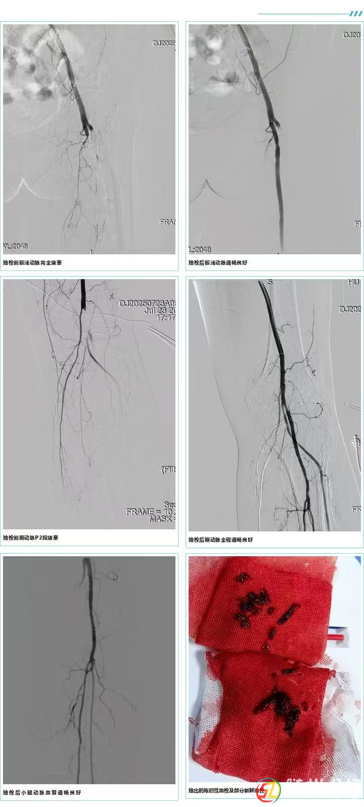 抽栓前股淺動脈完全堵塞抽栓后股淺動脈通暢良好抽栓前腘動脈P2段堵塞抽栓后腘動脈全程通暢良好抽栓后小腿動脈血管通暢良好抽出的陳舊性血栓及部分新鮮血栓